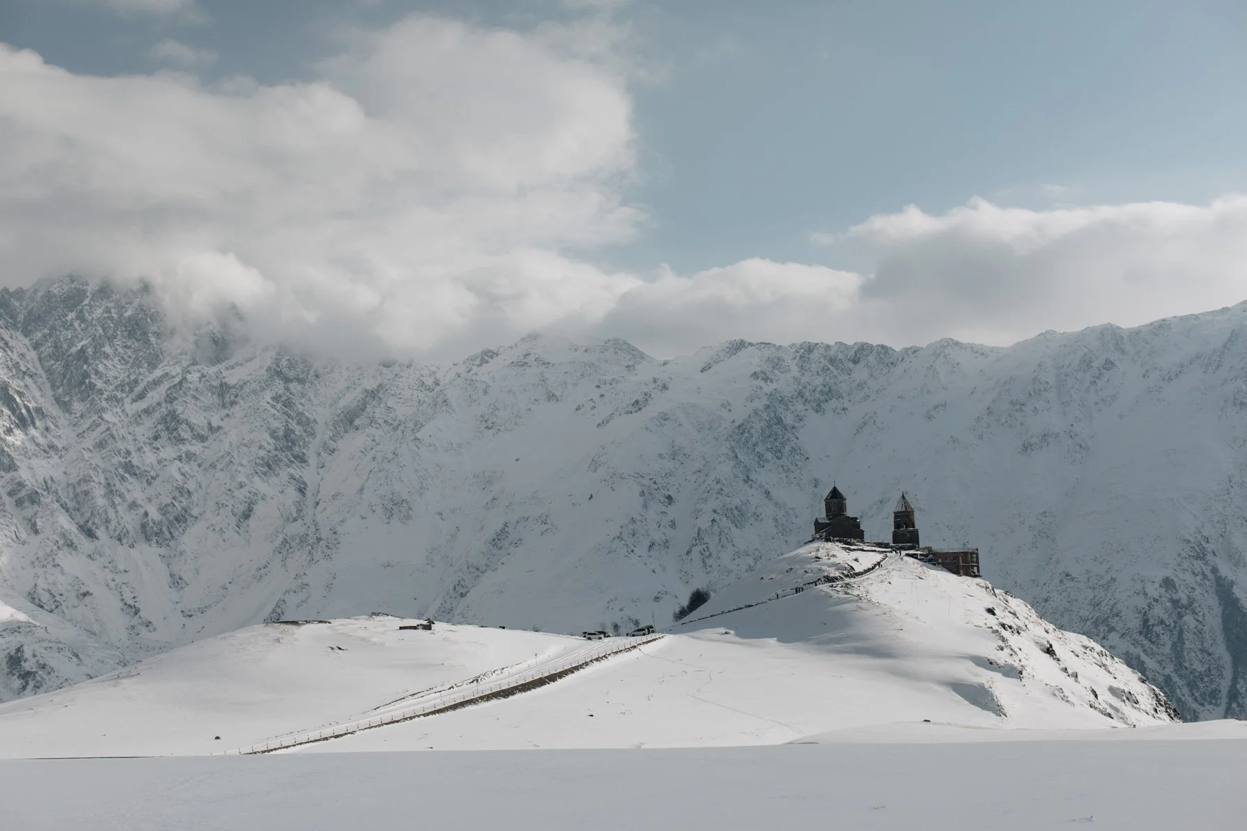 Kazbek i Stepancminda – klasztor Cminda Sameba na tle Kaukazu.